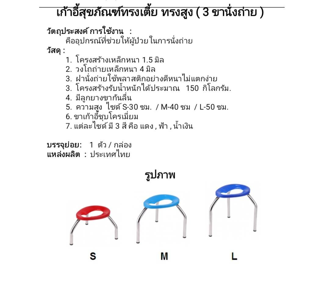 เก้าอี้นั่งถ่าย 3ขา ทรงสูง 50cm. (คละสี)
