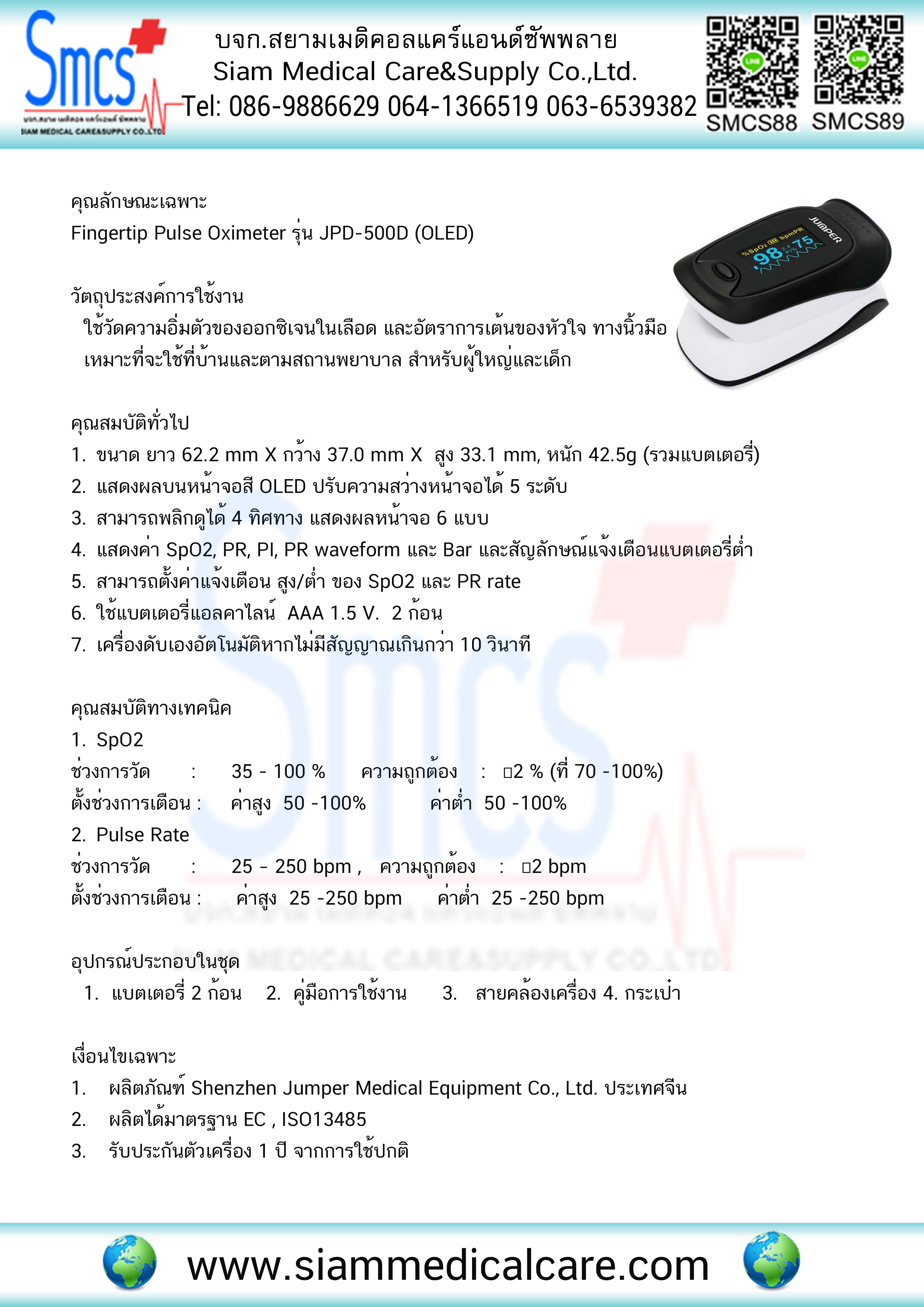 เครื่องวัดออกซิเจนปลายนิ้ว ( Pulse Oximeter Fingertip ) ยี่ห้อ Jumper JPD-500D